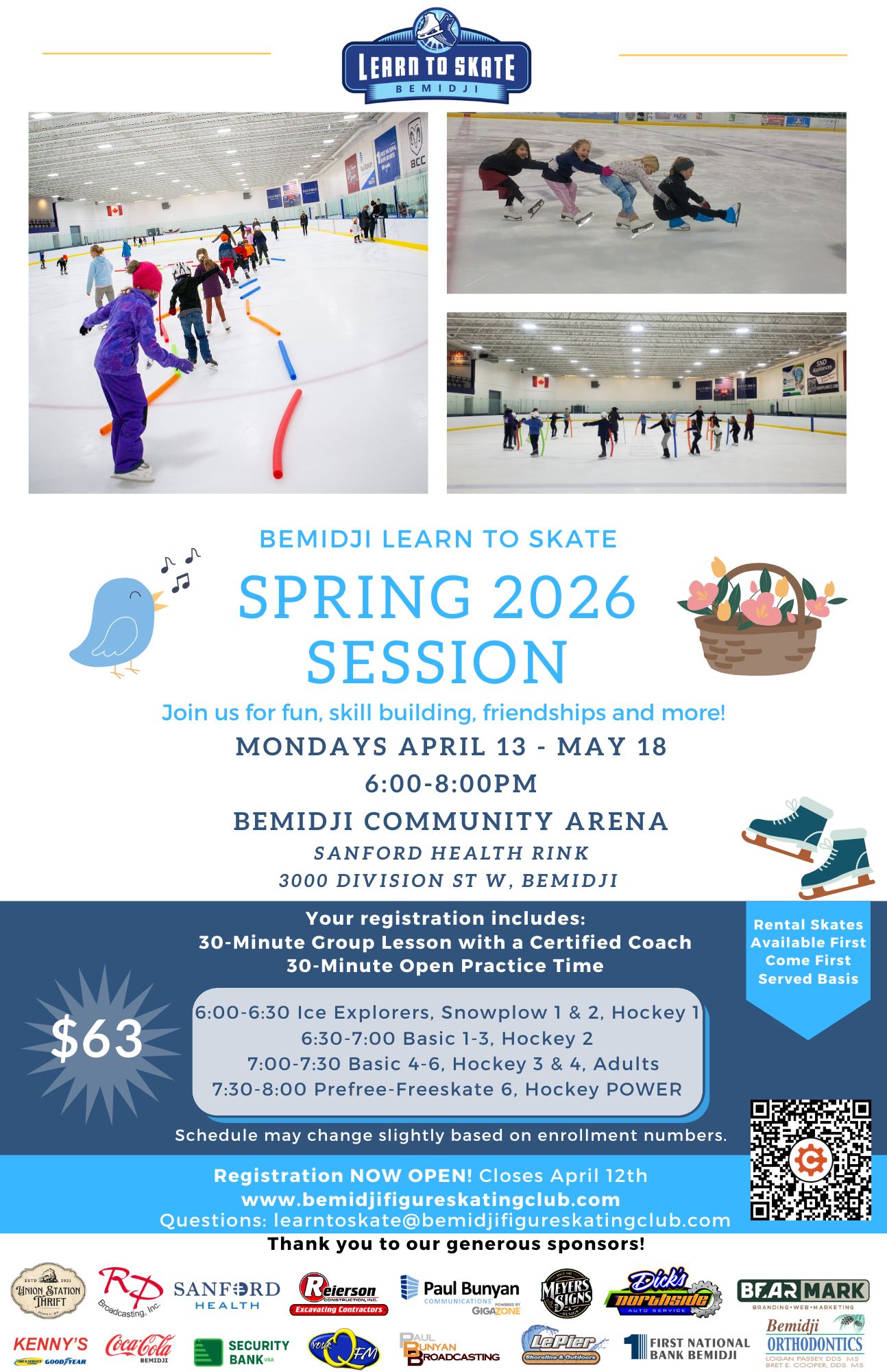 Monday classes run from April 13th through May 18th at the Bemidji Community Arena from 6:00-8:00pm (specific class times vary, see flyer). Additional Thursday class available for eligible skaters (Basic 4+, Hockey 4+, Adult 4+), April 16th through May 21st from 6-7pm. We have classes for ALL ages! Please email learntoskate@bemidjifigureskatingclub.com for any questions!